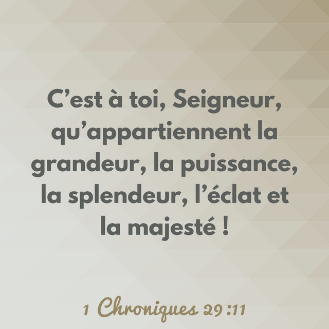 Cet article, publié dans 1Chroniques, est tagué Dieu, grandeur, majesté, puissance, splendeur. Ajoutez ce permalien à vos favoris.
