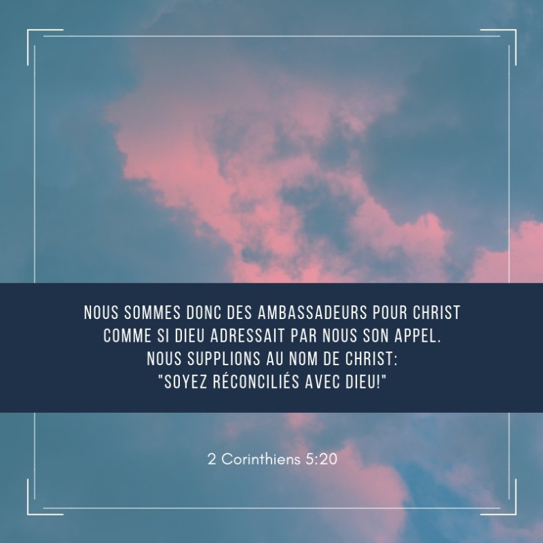 Cet article, publié dans 2Corinthiens, est tagué ambassadeurs, appeler, Christ, Dieu, réconciliation, supplier. Ajoutez ce permalien à vos favoris.