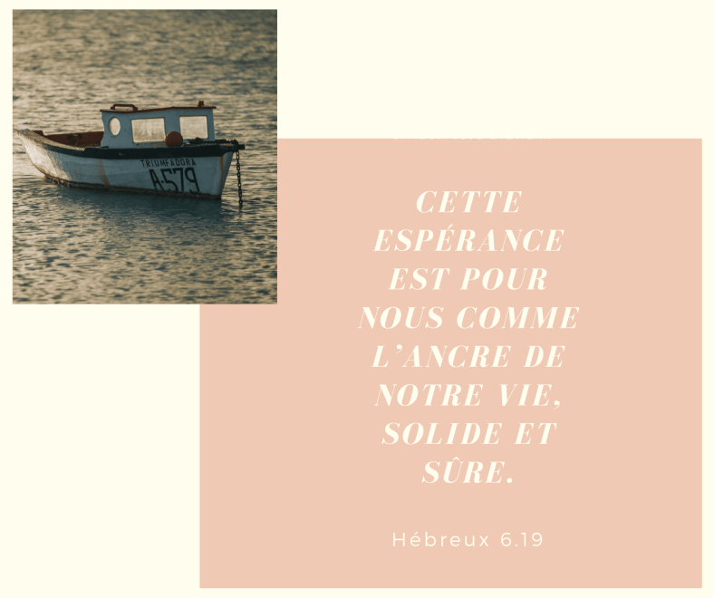 Cet article, publié dans Hébreux, est tagué ancre, espérance, promesse, sûre, semblable, solide, vie. Ajoutez ce permalien à vos favoris.