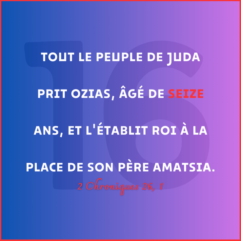 Cet article, publié dans 2Chroniques, est tagué 16, Amatsia, ans, à la place, Ozias, père, peuple, prendre, roi, SEIZE. Ajoutez ce permalien à vos favoris.