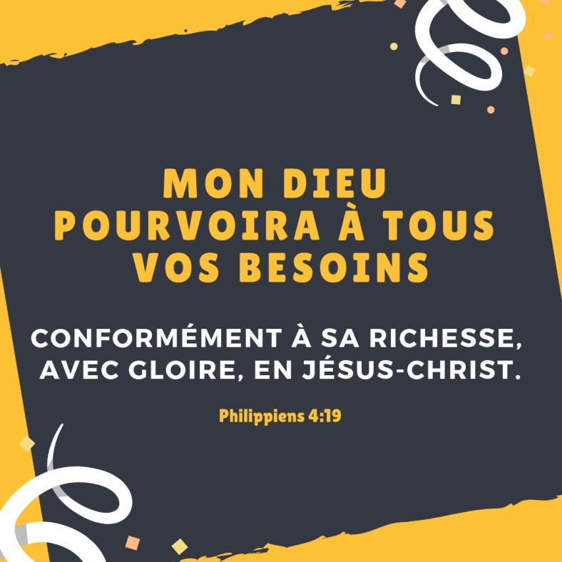 Cet article, publié dans Philippiens, est tagué besoins, conformément, Dieu, gloire, Jésus-Christ, pourvoir, richesse, tous. Ajoutez ce permalien à vos favoris.