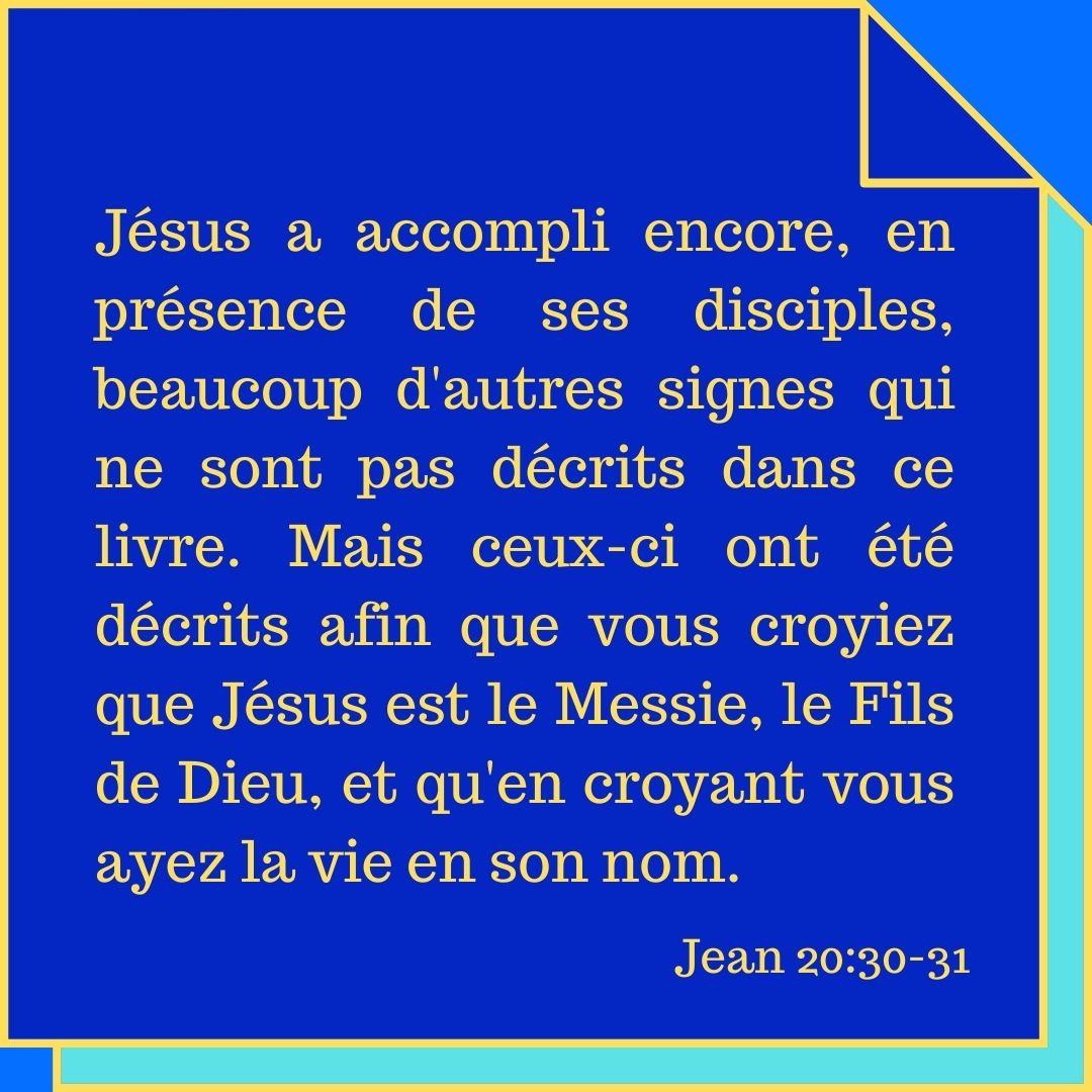 Cet article, publié dans Jean, est tagué accomplir, beaucoup, croire, décrit, disciples, en son nom, Jésus, la foi, le Fils de Dieu, livre, Messie, miracles, signes, vie. Ajoutez ce permalien à vos favoris.
