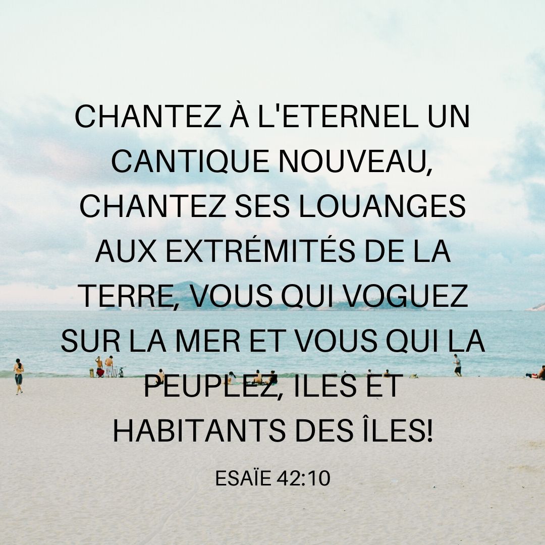 Cet article, publié dans Esaïe, est tagué îles, cantique, chanter, Dieu, extrémités, habitants, l' Eternel, louanges, mer, nouveau, peupler, terre, voguer. Ajoutez ce permalien à vos favoris.