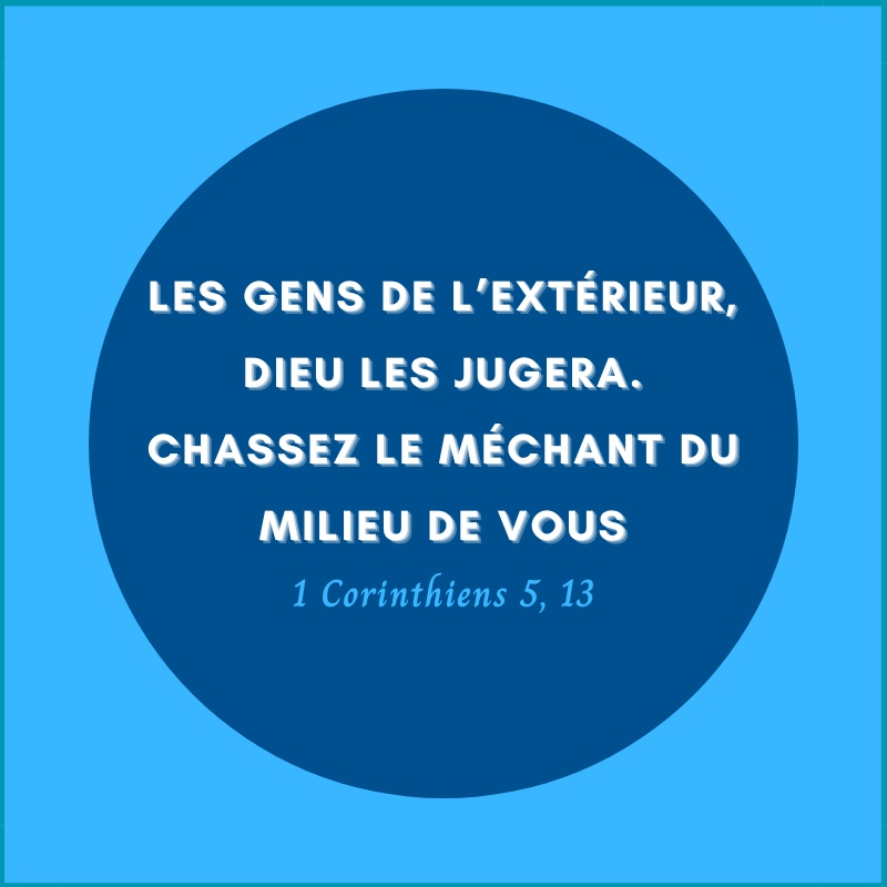 Cet article, publié dans 1Corinthiens, est tagué chasser, Dieu, extérieur, gens, juger, méchant, milieu. Ajoutez ce permalien à vos favoris.